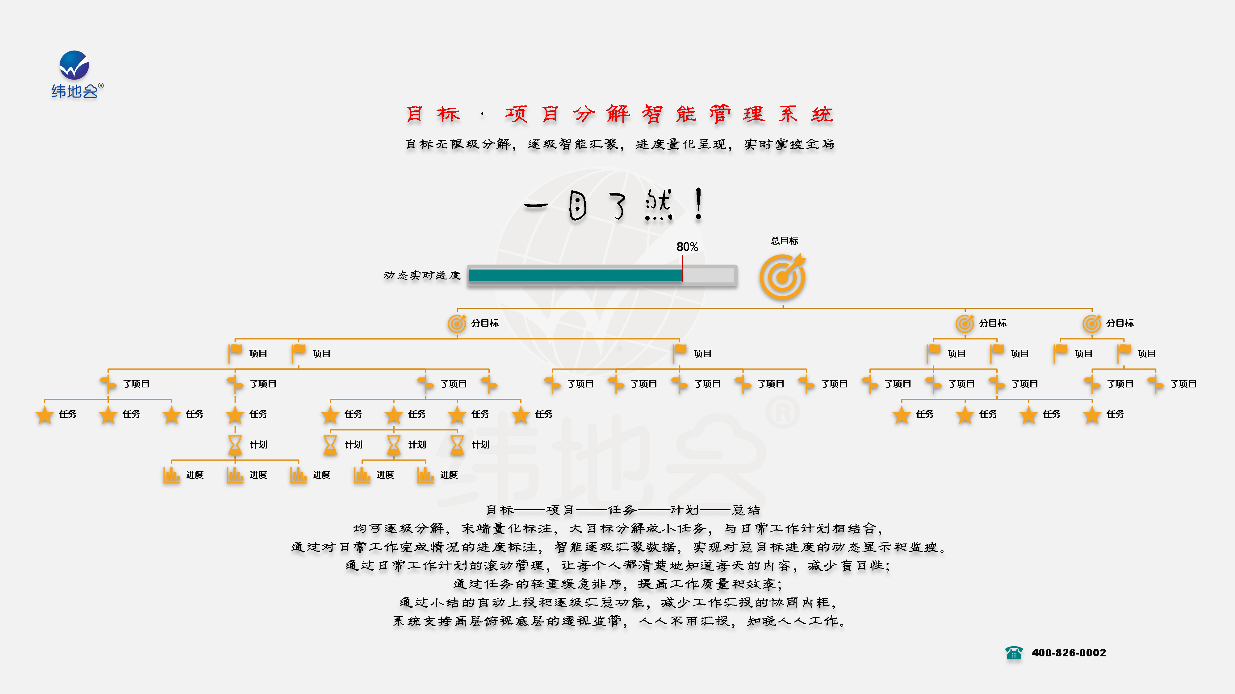 对目标的分解、落实情况及进度监控将成为您新的一年里重要的工作内容,为了帮助您实时掌控全局,我们“纬地云”特研发“目标分解与进度智能动态监控系统”,想必会助力您的伟业成功,敬请体验……